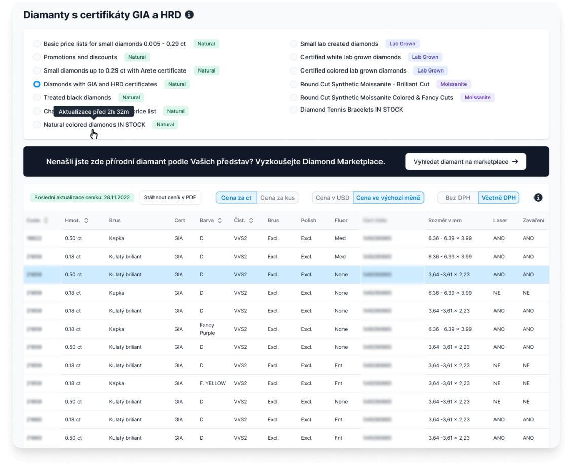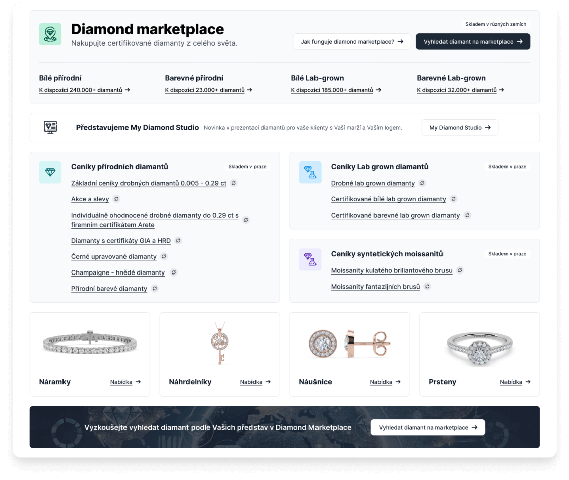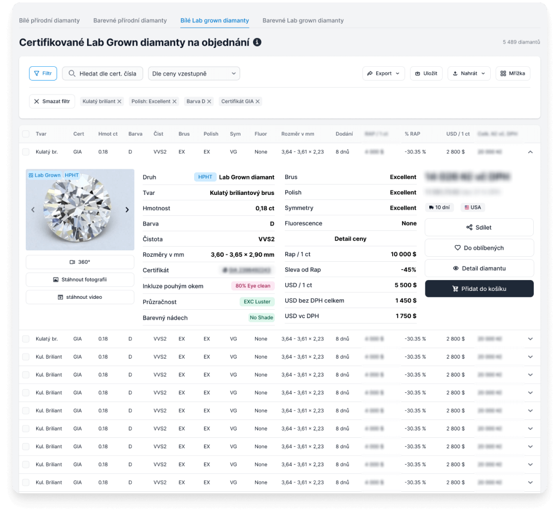 Zarejestrowani użytkownicy mają dostęp do cen drobnych i certyfikowanych diamentów oraz mogą zamawiać certyfikowane diamenty naturalne i laboratoryjne z całego świata na naszym Marketplace.